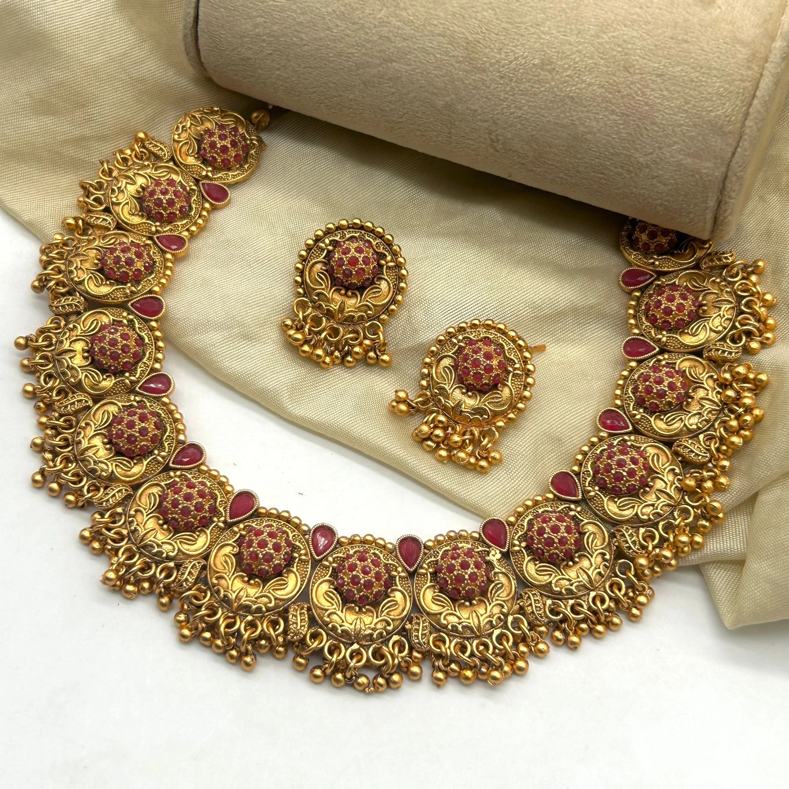 Add a royal touch to your ethnic style with this antique gold plated choker necklace set. Designed with detailed craftsmanship and ruby stone embellishments, it is ideal for South Indian bridal wear and festive outfits.